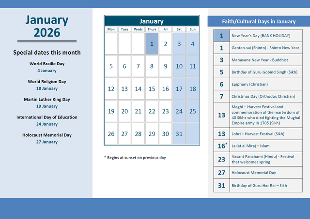 Religion/Faith dates and important cultural dates for 2026